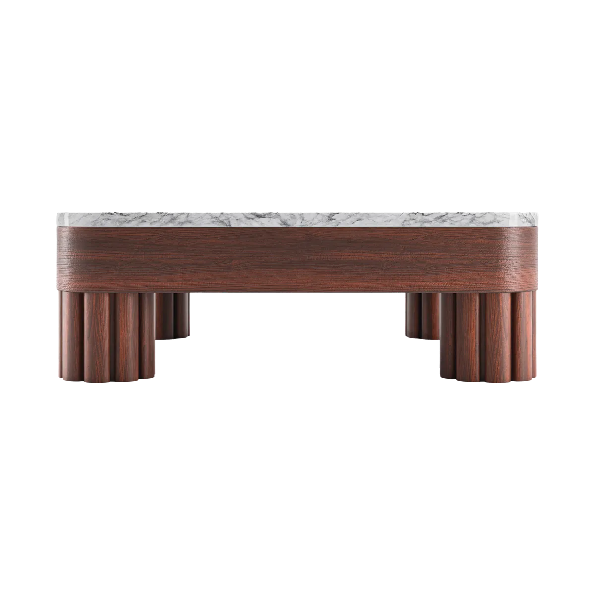 The Ripple Square Coffee Table distills the collection’s essence into a balanced centerpiece. The stone top evokes a still surface, cool, luminous, and grounding. Beneath it, the sculpted base rises in vertical repetition, echoing the language of carved pillars and softened geometry.