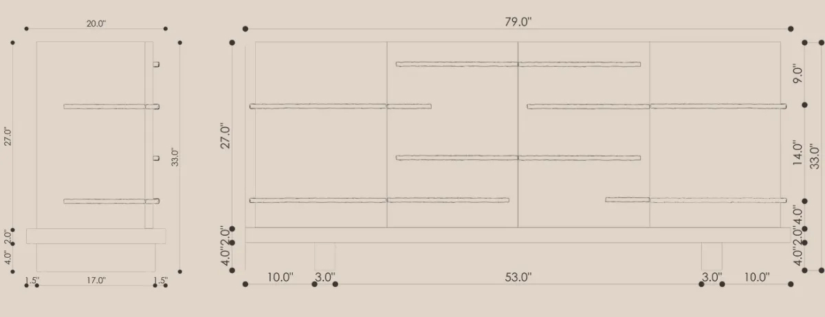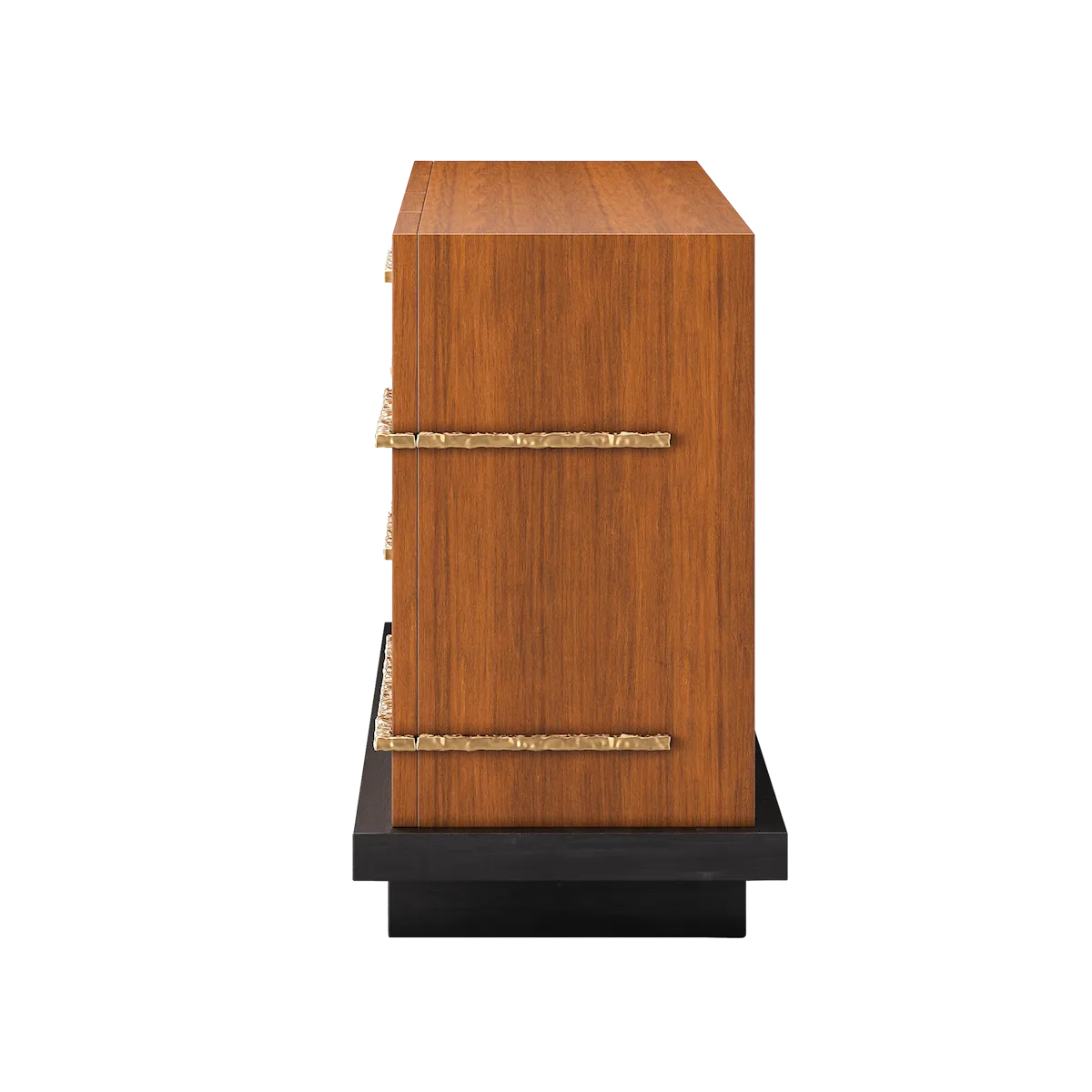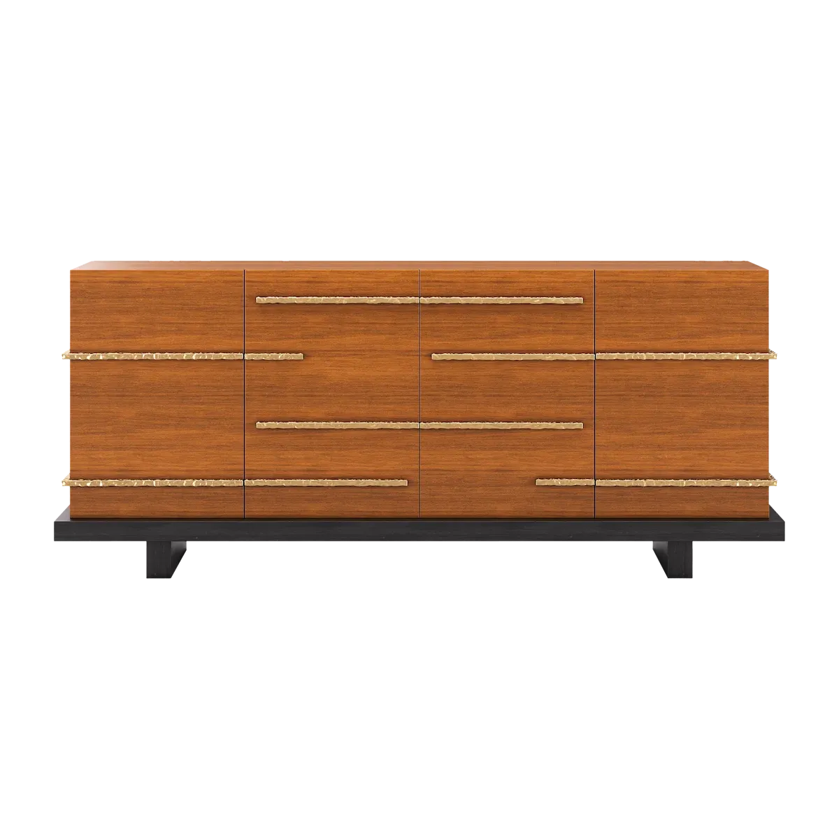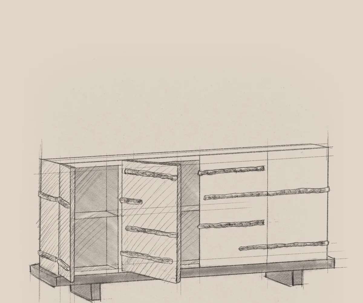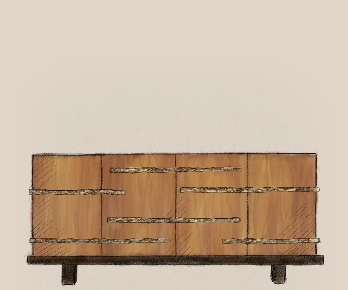 The Strata Sideboard translates tectonic memory into refined geometry. Horizontal brass inlays slice across its façade like mineral fractures, tracing silent events layered over time. Each drawer front is a surface of tension – warm against cool metal, stillness crossed by motion.